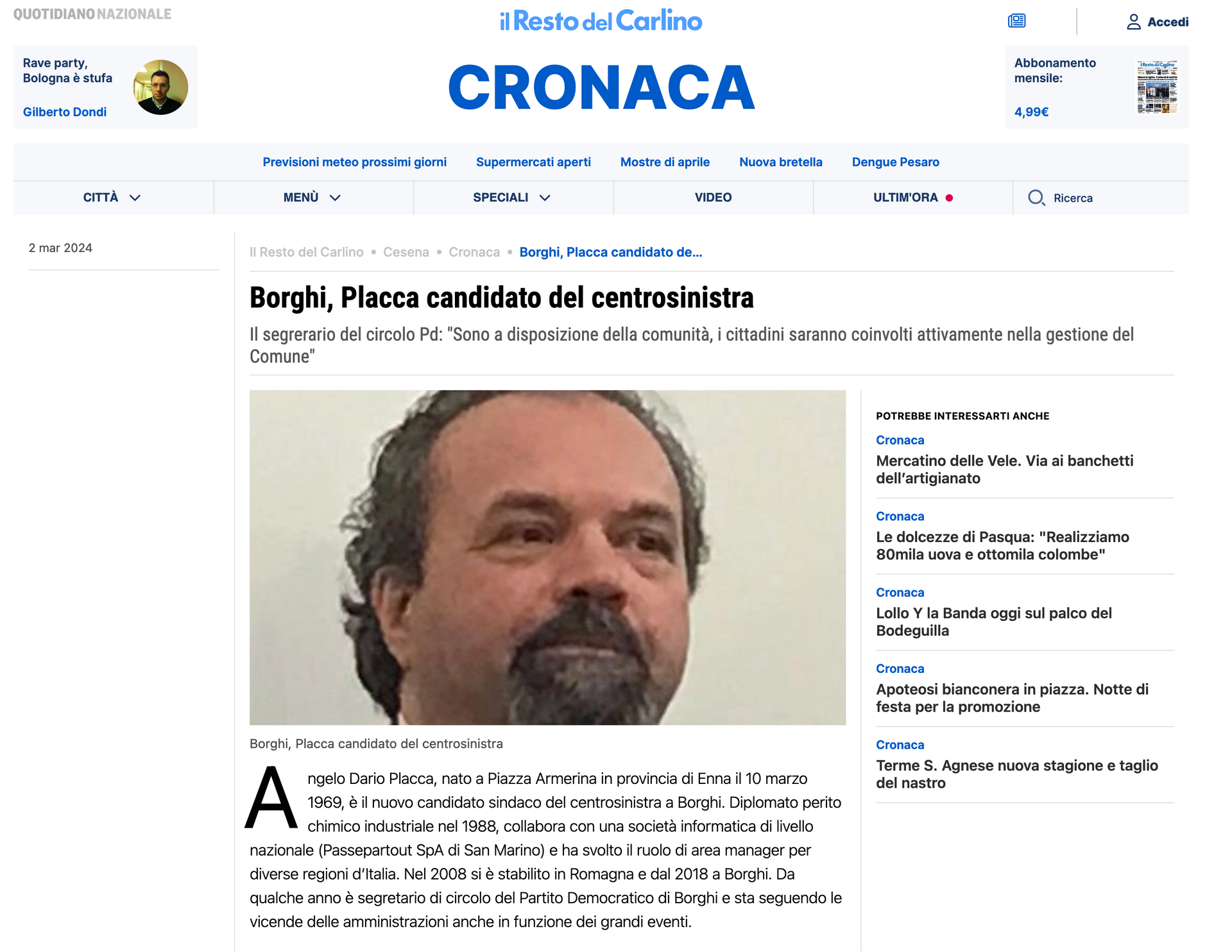 Angelo Dario Placca, nato a Piazza Armerina (EN), il 10 marzo 1969. Dal 2008 stabilito in Romagna, dal 2018 a Borghi.